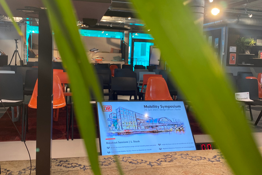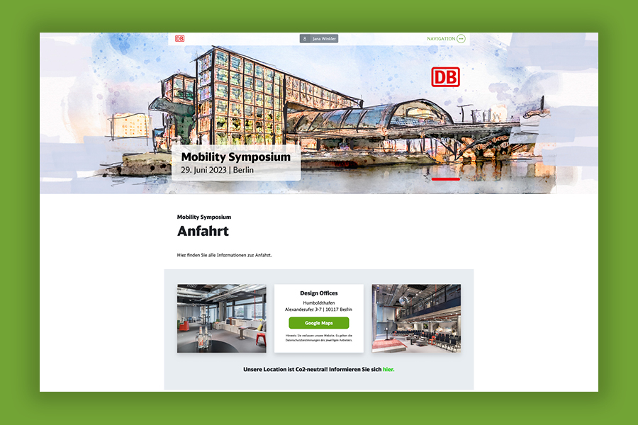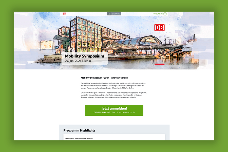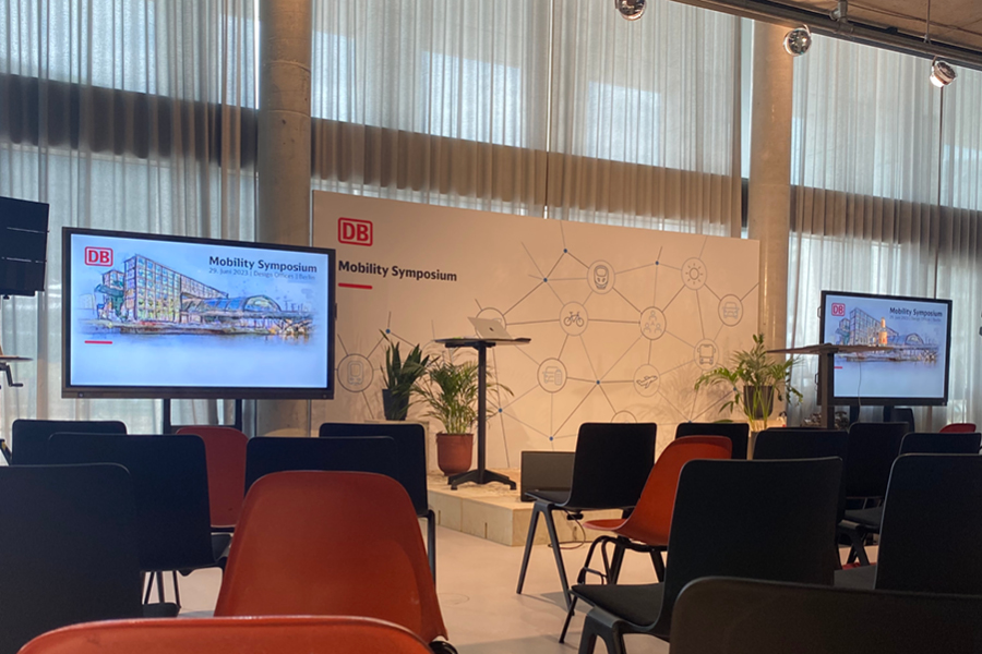 Am 29. Juni fand in den Design Offices Berlin Humboldthafen das Mobility Symposium der Deutschen Bahn statt. Das Format ist eine Plattform für Inspiration und Austausch rund um die Mobilität von heute und morgen. Unter dem Motto »New Work meets New Mobility« wurde rund 140 Gästen ein abwechslungsreiches Programm mit hochkarätigen Key-Notes, News aus dem DB-Kosmos sowie interessanten Breakout-Sessions präsentiert. Zudem konnte das Publikum mit über die Gewinner der Climate Mobility Challenge 2023 abstimmen. Wir freuen uns sehr, dass unsere all-in-one Eventplattform dabei wieder perfekt zum Einsatz kam.