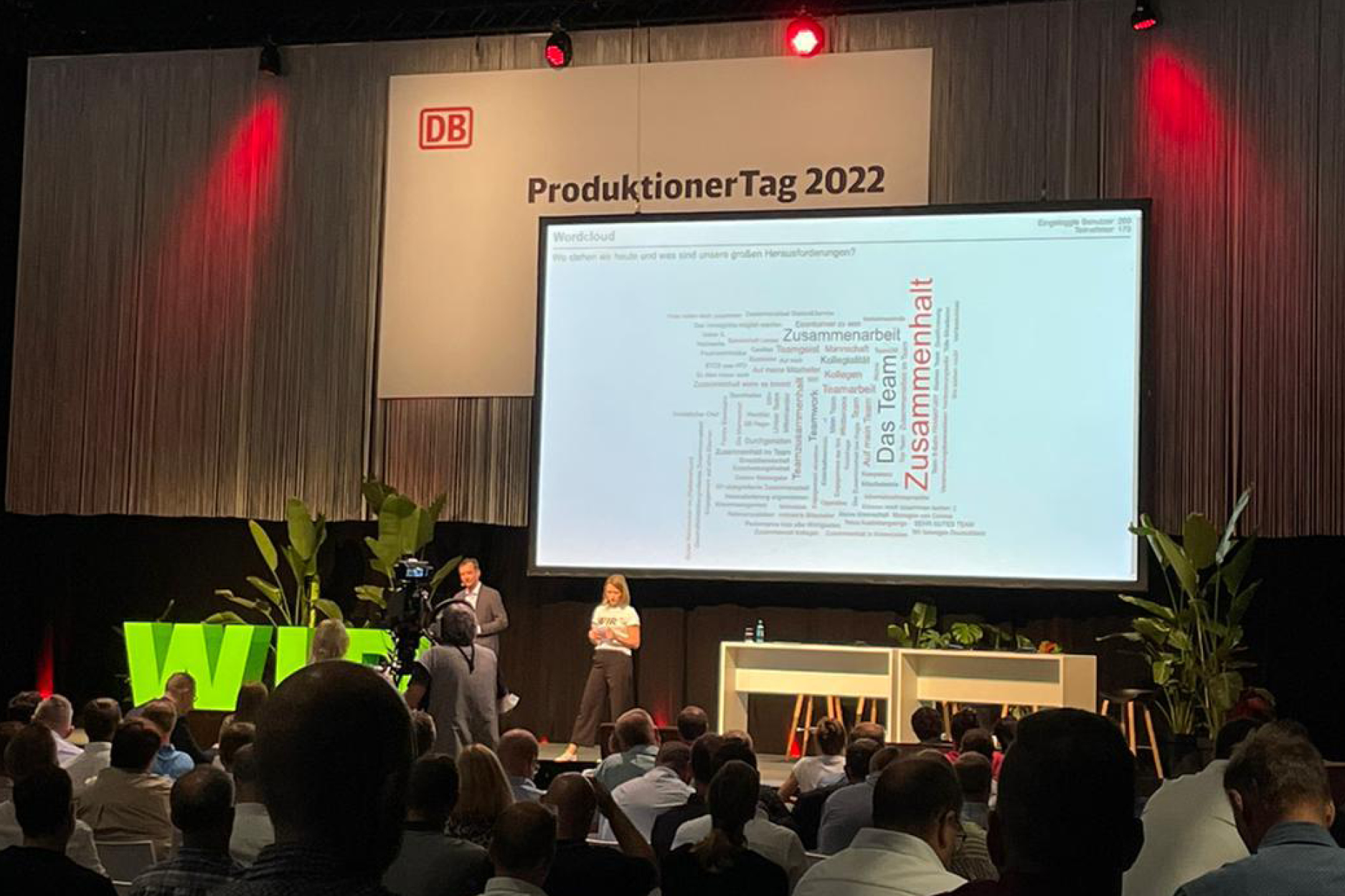 Der Produktionertag der DB Regio fand Ende August in der Halle45 in Mainz statt. Hier durften wir mit unserer Plattform und dem Teilnehmenden Management die rund 450 Gäste vorab einladen sowie vor Ort akkreditieren. Interaktion gab es dabei über Votings sowie die Wordcloud, welche in Workshops sowie im Plenum perfekt eingesetzt werden konnten.